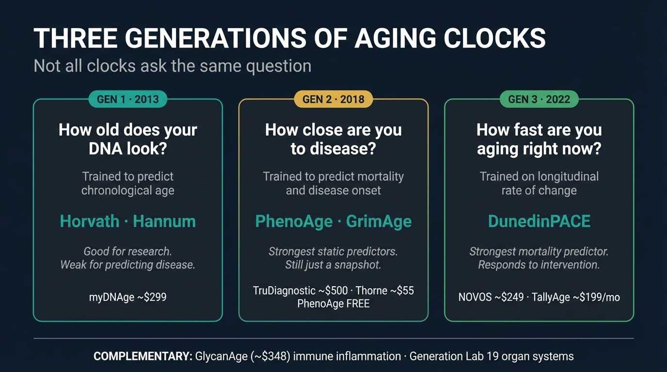 📌 First-generation clocks (Horvath, Hannum) are research tools, not clinical tools. They predict chronological age, not disease or death. Don't spend money on these for personal health tracking.